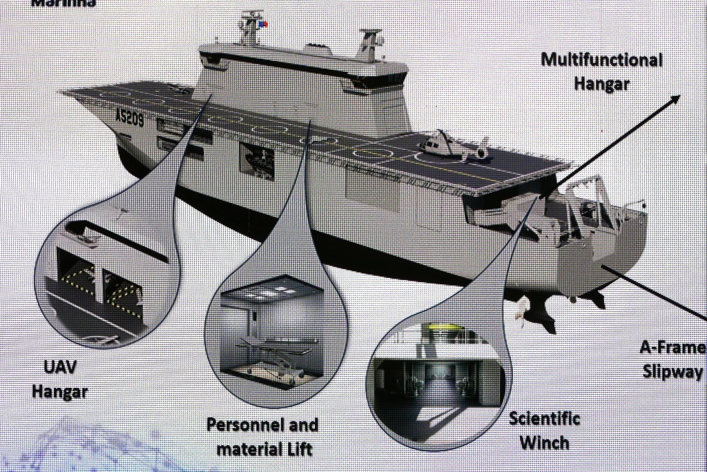 The capabilities offered by the flight deck and embarked package of unmanned air, underwater and surface vehicles provide a significant wider coverage compared to legacy combatant platforms such as frigates, while the multi-mission bay with slipway and side RO-RO ramp, associated to the capability of accommodating landing crafts and RHIBs, as well as the drop keel for the scientific equipment deployment, provides the means to effectively conduct different missions with a single platform, the Chief of Staff explained.