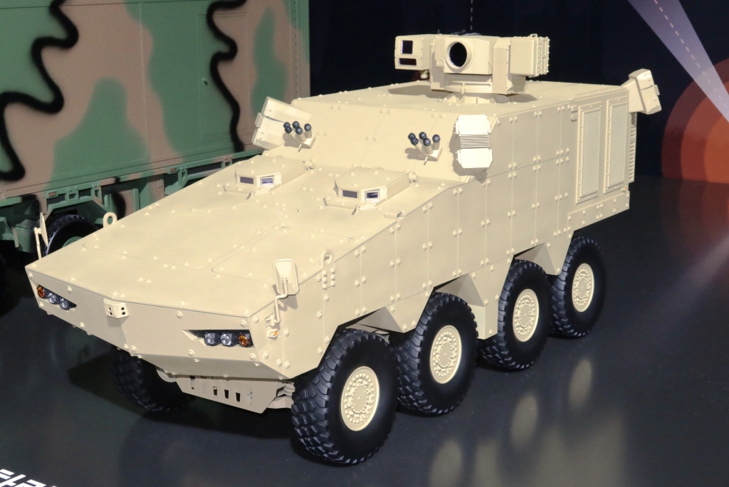 To have a fully mobile solution we will have to wait some more time, no timeline was provided, when Hanwha will develop a 50 kW solution to be installed on an 8×8 armoured vehicle. At ADEX 2025 a model of the Mobile Laser Weapon was exhibited, a typical 8×8 chassis with the rear compartment raised, the same version usually adopted for command posts and ambulances, and a trainable turret on top. A 1:1 model of that turret was also exhibited at the company stand. The vehicle will obviously host all main components, laser emitter, power generation and cooling; it will also be equipped with a jammer, providing a combined soft- hard-kill capability. As no timing for a prototype was provided, if this will come in some years it might be possible that a hybrid propulsion chassis might solve at least in part the power generation issue.