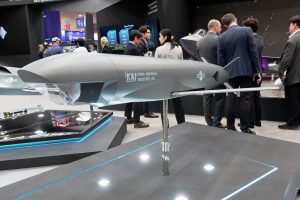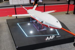 A straight upper wing airframe with V rudders and turbojet propulsion, the AAP could be seen flying in the video shown at the exhibition, the K-AI Pilot being able to fly through waypoints, autonomously avoid obstacles, minimising operator’s workload. It is also able to recognise targets, thanks to strong automatic target recognition (ATR) algorithms. A spiral development process is underway, EDR On-Line understood, the virtual pilot learning mission after mission thanks to machine learning, increasing the number of obstacles to be avoided, improving behaviour, and augmenting its ATR capability. A typical example was the detection of a transport-erector-launcher, KIA representatives saying that in time the system will be capable to detect multiple launchers. While currently the K-AI Pilot is flying on a single airframe, KIA is developing the system to allow teamwork, allowing for swarms of autonomous aircraft to perform complex missions. The AAP is the testbed for the K-AI Pilot, KIA exhibiting at ADEX two new unmanned air platforms that are part of the K-AI NACS, for Next-generation Aerial Combat System.