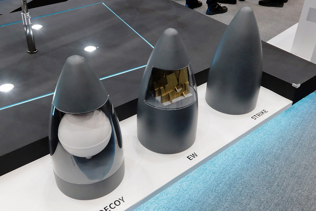 The payload is installed at the front. Four payloads were proposed, ISR, decoy, electronic warfare, and strike, maximum mass allowed being 20 kg. The intelligence, surveillance and reconnaissance payload was not displayed with the other three alongside the airframe, as it was the one installed, the transparent cover allowing to see the gimballed payload with day/night sensors. The SUCA has a take-off/launch mass of 220 kg, can reach targets at a maximum distance of 300 nm, and can operate in swarms, exploiting the capabilities of the K-AI Pilot.