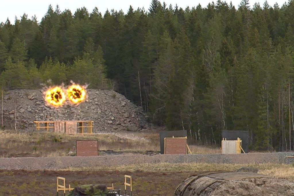 The HE 448 was used intensively during the two-day event. In the operational setup at the Swedish Army’s Combat Training Centre for Military Operations on Urban Terrain in Kvarn a volley of three rounds was used to neutralize infantry on the retreat after its fighting vehicle had been destroyed by a HEAT round. On Day Two, at the Bofors Firing Range in Karlskoga, the first HE 448 of the day was fired in the anti-armour session against an old Swedish Army PBV 301, which was retired in the late 1960s, the round being fired in its impact mode in order to demonstrate its penetration capacity. Session 2 was devoted to anti-structure/anti-personnel use.