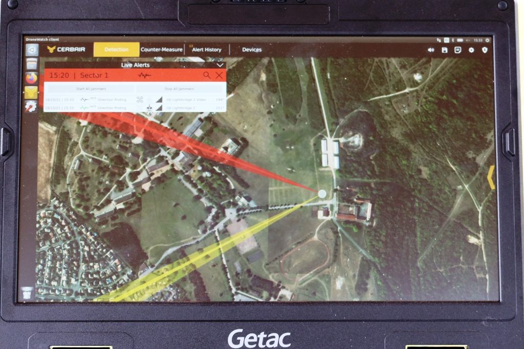The event at Beynes allowed to see in action the various products of both companies, capable to detect, identify, locate and neutralise a quadcopter. Cerbair developed systems capable to analyse the radiofrequency spectrum, compare the signal protocols emitted and pick up those that correspond with its data base, giving an alert as well as information on the potential threat; two indications can be provided, that on the air vehicle and that on the command signal origin, different actions being then carried out.