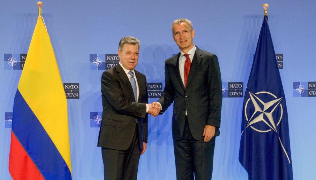 in Brussels on the final day of May 2018 Colombian president Juan Manuel Santos paid an official visit to NATO Headquarters where he was met by Jens Stoltenberg. NATO and Colombia have concluded a partnership agreement with a view to strengthening dialogue and cooperation to address shared security challenges. Despite geographical distance, cooperation has been developing progressively since 2013 in a number of areas including military education and training, maritime security, good governance and building integrity.