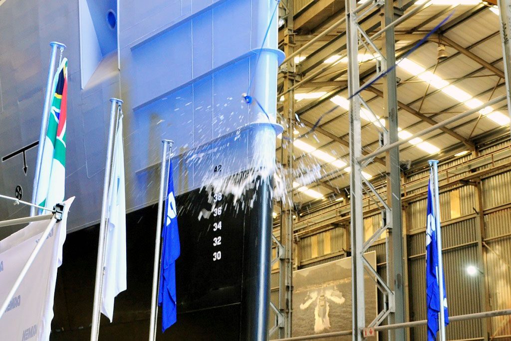 During the event, the vessel was blessed and a bottle of champagne was broken over the bow as is the custom. The South African flag was raised on the vessel and she was cheered by her crew. Sam Montsi Director at DSCT said, “Despite the low-key nature of the event, this remains a momentous occasion – the blessing of the first of these three important vessels that we are building in Africa for Africa. With this taking place as the global pandemic continues, every care has been taken to ensure the well-being of everyone here today. This counts also for the day-to-day work on the project, with strict safety measures in place. Because of these measures we can continue our work on the vessels and remain on time and on budget, something in which we can all take pride.”