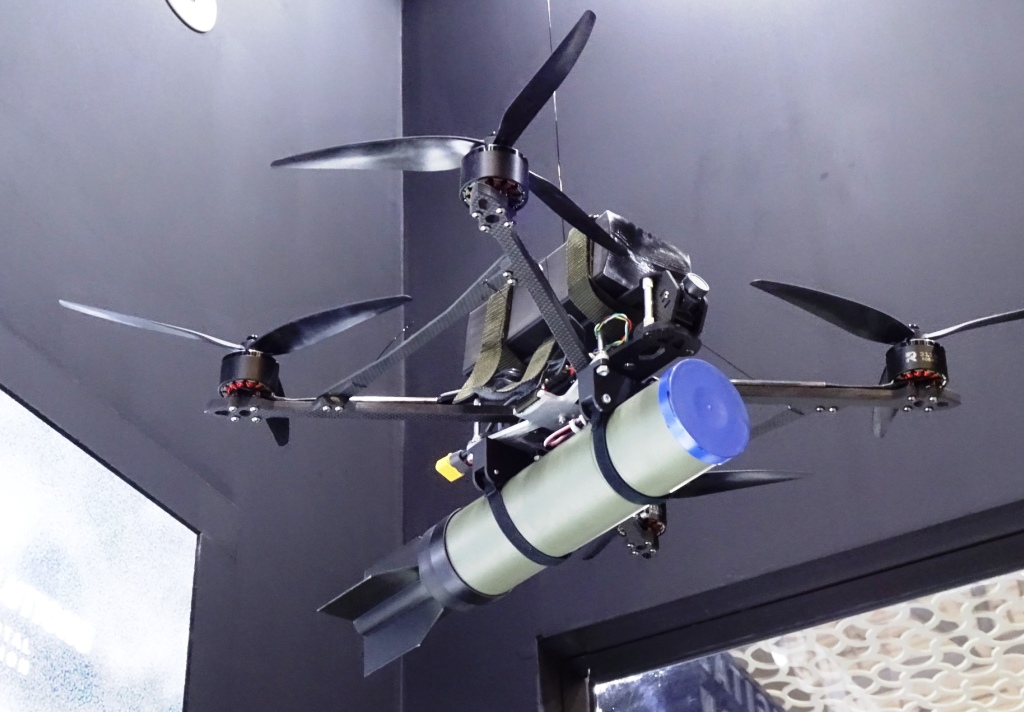 The company’s booth also featured a kamikaze/bomber FPV quadrocopter drone with a radio channel. It uses a high-explosive fragmentation or shaped-charge warhead. Its penetration of rolled homogeneous armor (RHA) is 200 mm.