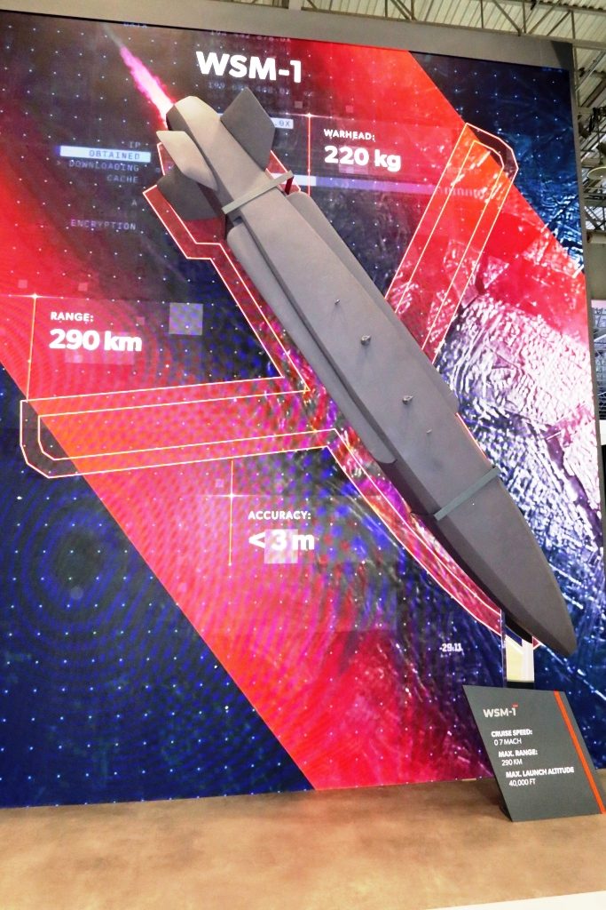 During the exhibition the veil was lifted on many details regarding the WSM-1, which the company defines a next-generation low-cost cruise missile that bridges the gap between long range glide precision guided munitions, and conventional air-launched cruise missiles. A turbojet powered cruise missile, the WSM-1 is capable to fly at a speed up to Mach 0.7, and reach targets at 290 km carrying a 220 kg warhead, which can be a high-explosive pre-formed fragmented or a penetrator. The WSM-1 can fly at altitudes up to 40,000 ft and dive on the target, hitting it with a 3 metres accuracy thanks to its navigation and targeting sensors. In the final attack phase guidance is provided by a next-generation imaging infrared seeker, while a resilient anti-jamming global navigation satellite system (GNSS) aided with an inertial navigation system (INS) ensure the WSM-1 reaches the target area, where the IIR sensor takes over. Other advanced features include artificial intelligence-assisted terminal retargeting, 3D waypoint navigation, and dynamic flight and attack profiles. No information was released on the programme status.