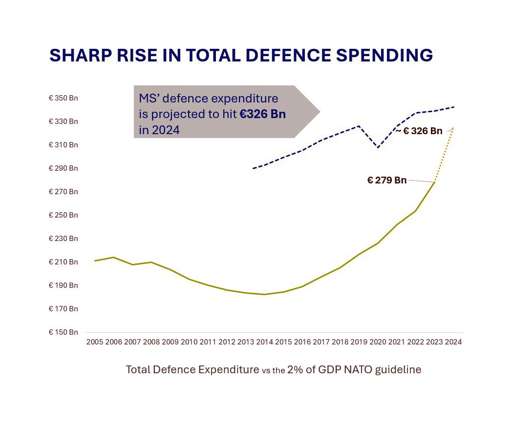 European Defence Agency data shows that EU Member States are closing the gap in 2024 towards the NATO 2% guideline, as Member States’ total combined defence expenditure is set to reach 1.9% of EU GDP. This is possible thanks to a more than 30% increase in defence spending compared to 2021, with defence spending in 2024 estimated to have reached €326 billion, exceeding earlier projections.