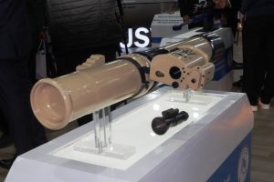Another weapon shown was the Sakr 105 Launcher, destined to infantrymen, which can be operated by a single soldier. The system is made of a reusable launcher element, which has a mass of 3 kg, and can be used to launch up to 200 rockets. The launcher tube is 370 mm long, and on its left a rail allows installing the D-98 optronic sight developed and produced by Arab International Optronics (AIO). Although not much was unveiled of the D-98, this should be a fire control system with day and night capabilities, capable to extend the target acquisition range up to 700 metres. Two type of ammunition are available, one high explosive, possibly with pre-fragmented case, and one thermobaric; these are inserted in the launch tube from the back, no indication of length being provided, diameter being 105 mm, and no indication of mass was made available. Targets considered for the Sakr 105 are light armoured vehicles, soft skin vehicles, personnel, buildings etc. The effective range is 350 metres, however engagement range when using iron sights is limited to 160 metres. Minimum effective range is 50 metres, probably due to the time needed to arm the warhead, while a 30 metres safety space is required behind the launcher.