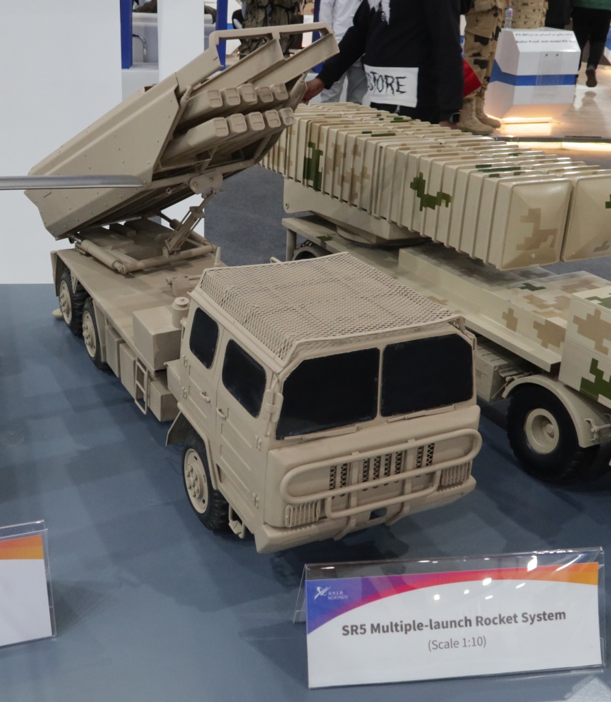 The SR5 multiple rocket launcher system, produced by Norinco of China, carries a single missile module which can host 20 122 mm rockets, six 220 mm rockets, four 300 mm rockets or a single 610 mm rocket, all guided. The 122 mm has a mass of 78 kg, 18 kg being the warhead, and a range of 20-45 km; the 200 mm mass is 300 kg, 70 kg being the warhead, with a range of 25-70 km; the 300 mm rocket mass is 400 kg, with a 100 kg warhead and a 30-15 km range; and finally the 610 mm rocket has a mass of 1,500 kg, with a 200 kg warhead and a 100-290 km range. This will give an increased flexibility to the Egyptian Army artillery, as even within the same battery different launchers will be able to use different rockets, allowing to answer fire missions at different ranges with different effects.