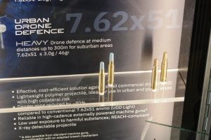 A completely different approach is that followed by RWS to solve a similar problem, the Fürth-based company developed the UDD rounds, the acronym standing for Urban Drone Defence. These rounds were unveiled at Enforce Tac 2025; they are both in the same calibre,7.62×51, but have two different polymer bullets, the UDD Light blue bullet has a mass of 1 gram (15 grains) while the UDT Heavy has a brown bullet which mass is short of 3 grams. Their shape was purposely not optimised ballistically, to lose energy quite fast, thus reducing the risks of collateral damages, this being one of the key design parameters. Nonetheless it allows the UDD Light to maintain sufficient energy to shoot down small commercial drones, such as a DJI Phantom 4, at 100 metres range. At that same distance the UDD Light does not penetrate a glass.
