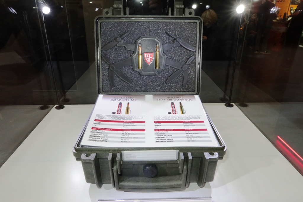 As many ammunition companies, Fiocchi, part of the CSG group, is looking at the threat posed by drones, and is proposing solutions to provide the warfighter with a self-defence capability. At Enforce Tac it unveiled a new ammunition, the 5.56×45 SJ 77 MB DD W-BITE, optimised for the C-UAS role