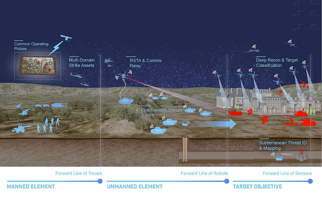 The forward line will therefore be robotic, the contact with the enemy beginning with reconnaissance carried out by UAVs, swarming over target objectives to do target classification, assets further back doing long range reconnaissance as well as targeting, guiding smart munitions, and finally forward line robots will engage the enemy to disrupt and weaken him by attrition, also entering buildings and subterranean structures to map, identify threats, look for hazardous materiel, weapons of mass destruction, CB threats, IEDs, all this forward of the manned element, allowing to put a stand-off distance between soldiers and enemies.