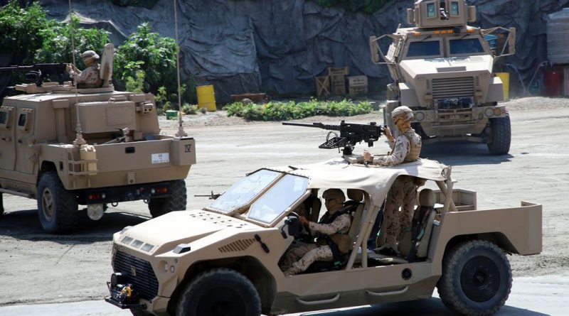 The show allowed to see in action most of the UAE Armed Forces systems. In the air F-16s run numerous CAS missions while the Saab 340 AEW&C aircraft provided surveillance, a C-17 simulating an airdrop; as for rotary-wing aircraft AH-64A Apache and UH-60 Blackhawks, the latter armed with Miniguns, provides fire support, CH-47 Chinook representing the transport chopper fleet. On the ground the heaviest system was definitely the Leclerc MBT, however the star of the show was the new Rabdan 8×8 IFV, which first batch was delivered by Al Jasoor in late 2018. Nimr Jais 4×4 and Ajban 440A were acting in numbers, Special Forces team deploying aboard Nimr RIVs (Rapid Intervention Vehicles) while security detachments used Ajban ISVs (Internal Security Vehicles). The mine and IED presence required engineers intervention, these using mostly MRAPS such as BAE Systems’ Caiman 6×6 and Navistar’s International MaxxPro 4×4, as well as Oshkosh M-ATVs with mine rollers.