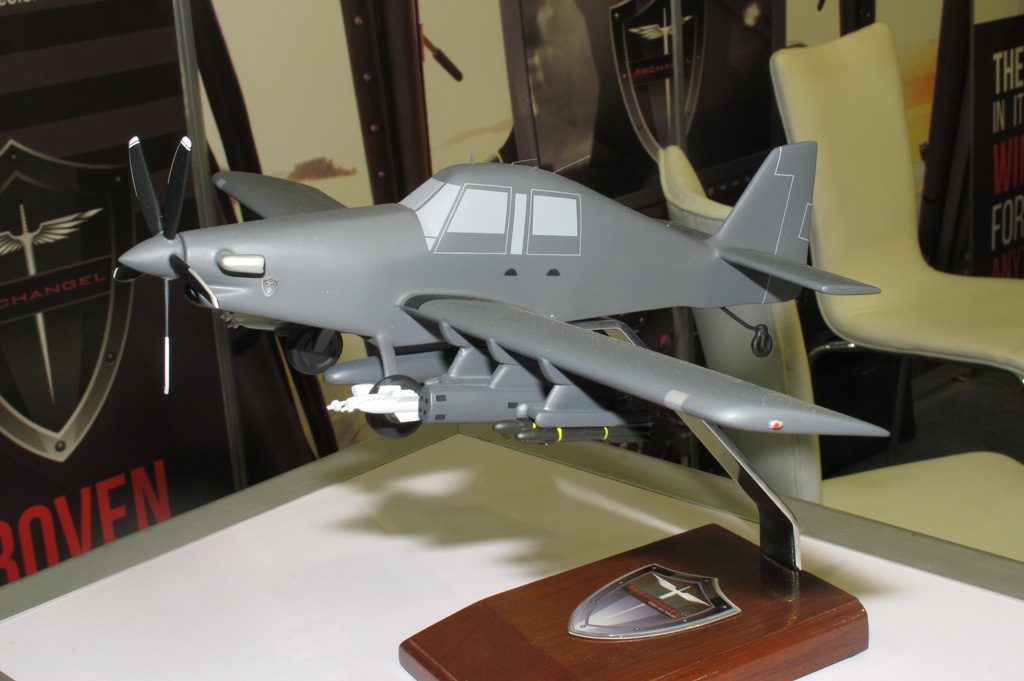 With a Maximum Gross Takeoff Weight of 6,713 kg, the Archangel is powered by a Pratt & Whitney PT6A-67F turbine providing 1,700 SHP driving a five-blade propeller, cruise speed being 180 knots with external stores. Fitted with a roll-cage structure to ensure maximum survivability to its two-man crew, the aircraft is 11 meters long and has a 17.4 meters wingspan, three hardpoints per side allowing to carry a considerable payload, a further centreline hardpoint allowing to host a dedicated pod with integrates ISR sensors and self-protection systems. The Archangel can currently be armed with GBU-12/58 Laser Guided Bombs, AGM-114 Hellfire missiles, and CIRIT 2.75” Laser Guided Rockets. The crew is hosted in tandem seats and can profit of the digital cockpits, for flight and ISR/weapon systems management.