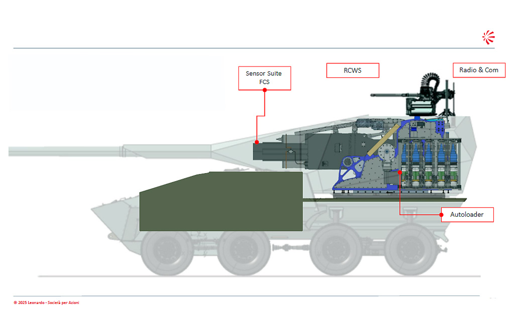 The reduced crew led the Leonardo design team to consider an automated solution for reloading the howitzer, which needed soldiers to expose themselves to possible threats for the least possible time. Two apertures will be available at the outer rear of both magazines, while a reloading module is being designed that will be installed on a platform. This will flank the howitzer and a robotic arm, quite probably a derivative of those used in the autoloader, will ensure reloading with the crew remaining in the protected cabin. The only manual reloading will be needed for primers, but considering their dimensions and the limited number this should be a quick operation.