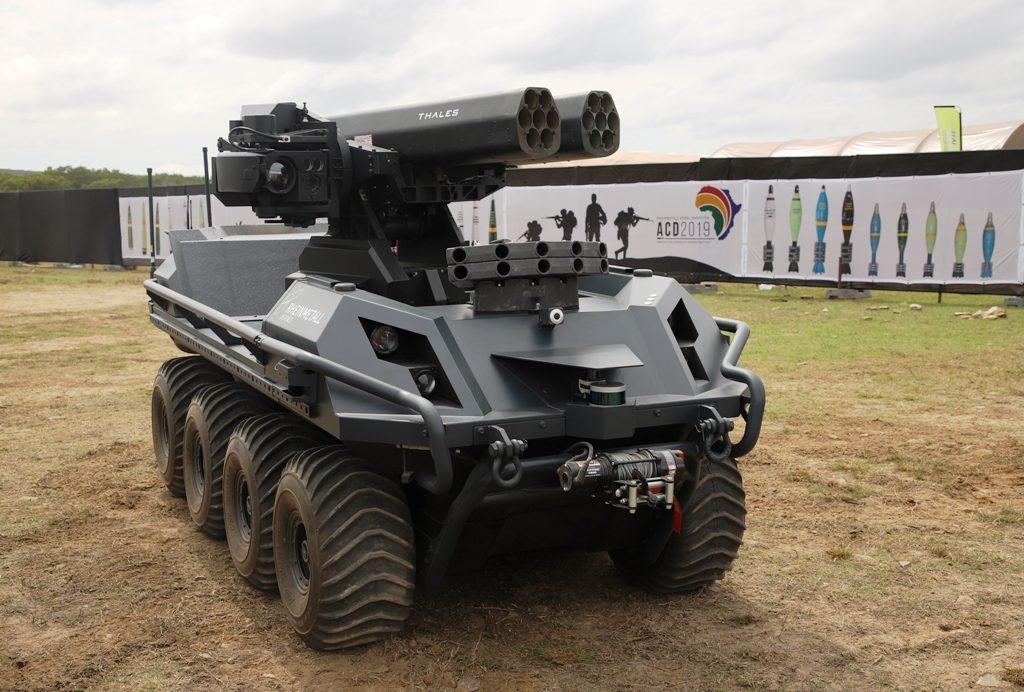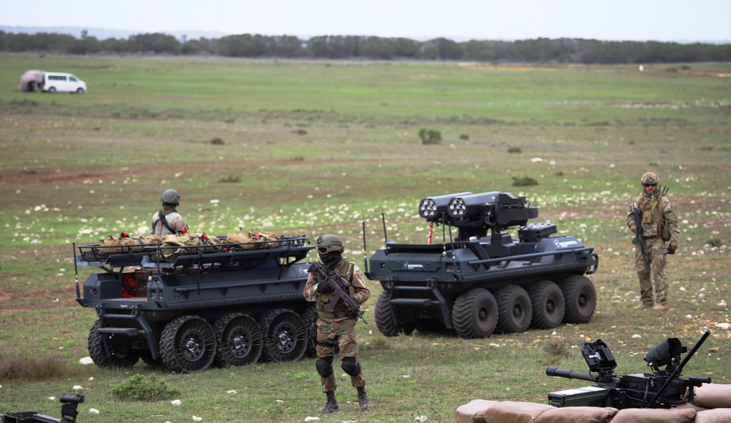 A ripple of 14 rockets hits the enemy outpost, the barrier of fire having been launched from a mere 750 kg kerb weight 8×8 unmanned platform, the firing order coming from a single South African Special Forces operator located at safety distance, controlling the Mission Master Protection UGV and mostly important its weapon system via its PDA with a simple Human-Machine Interface. Further back, the rest of the SF detachment is waiting, supported by a Mission Master Rescue, the CASEVAC version of the 8×8 UGV developed by Rheinmetall Canada. During the insertion phase both unmanned vehicles deployed using the “follow me” function, rolling alongside the SF warfighters, leaving these free to carry on their mission without worrying about their support vehicles, which added consistent organic punch and medical capacity to the team, something that would have been impossible without those UGVs.