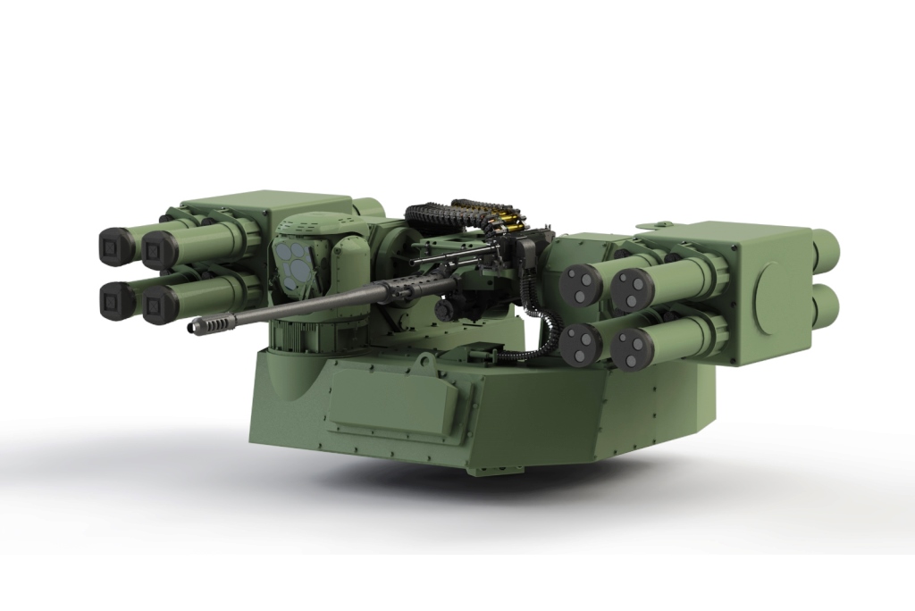The vehicle-mounted RIwP being shown is specifically configured for the British Army’s current SHORAD requirement within the Land GBAD Programme. The exhibit includes missile canisters for the in-service High Velocity Missile (HVM) and the Lightweight Multirole Missile (LMM), as well as an advanced gunner’s sight. Additional lethality – and an example of RIwP’s versatility – is provided by a 30x113mm main gun and an M240 7.62mm machine gun, which can co-exist on the same turret as the missiles with no degradation in effector performance.