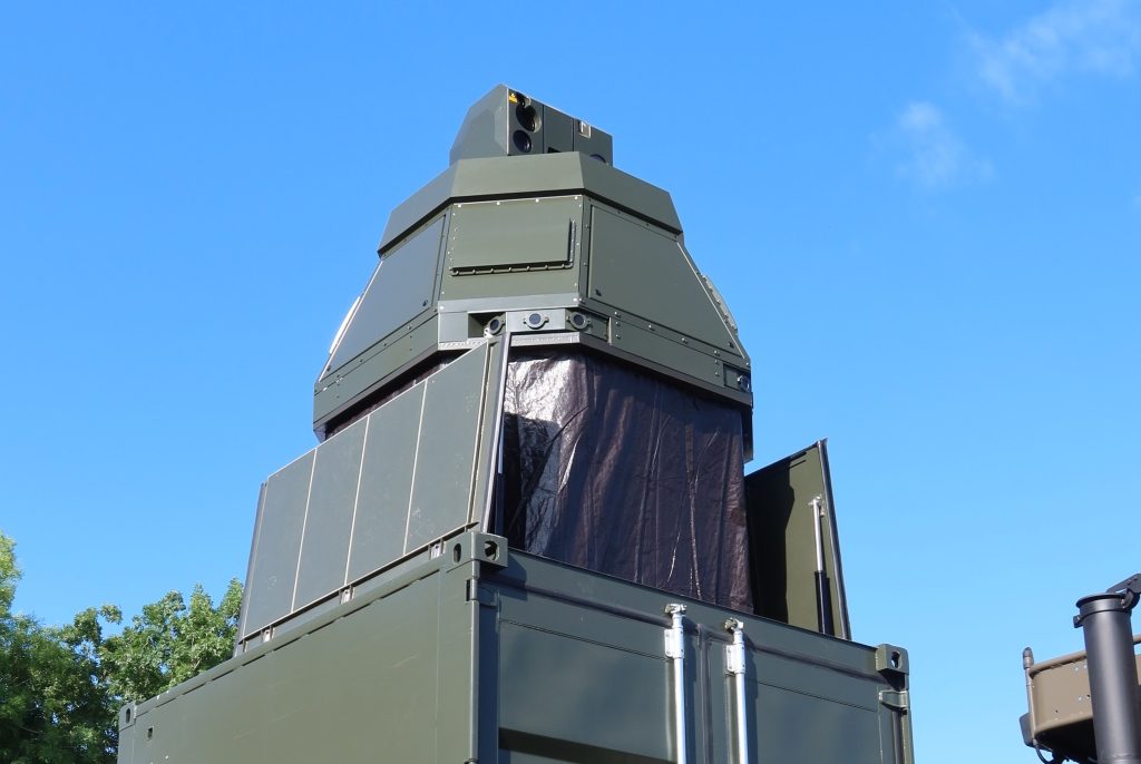 Sensors are installed on a flat top octagonal pyramidal structure, the main one being the 3D Oerlikon AESA Multi Mission Radar (Oerlikon AMMR) announced in early April, purposely developed by Rheinmetall Italia for SHORAD/VSHORAD applications. The MSU S is fitted with four AMMRs in the single tile staring configuration, which have a 550×380 mm antenna with a mass of 25 kg such, each module covering ±45° in azimuth. The four AESA antennas thus providing full 360° coverage and are installed on the structure, which has an angle of around 70° from horizontal, allowing an elevation coverage of –5° up to +70°. The S-band radar has a detection range of over 20 km on a 1 m2 RCS air target, data provided by the company showing an over 12 km detection range against hovering helicopters, 10 km against missiles and 5 km against RAM targets and micro-UAS. The AMMR can track while scan up to 150 targets, with 40 high priority targets. Once a target has been detected, the electro-optical tracking head installed on top of the structure is used to automatically verify and classify the approaching threat thanks to Artificial Intelligence algorithms. The 2-axis stabilised head hosts a cooled MWIR HD thermal camera with three fields of view (FoV), narrow (1.3°), middle (4.6°) and wide (21.8°) as well as a Full HD TV day camera, black and white or colour depending on customer choice, with a continuous zoom allowing a FoV of 1° to 30°. The optronic head also contains a Class 1/1M eye safe laser rangefinder with a 5 Hz repetition rate and a maximum range of 20 km. The optronic tracker is optimised for air targets and rotates on 360° with an elevation arc of –5°/+85°.