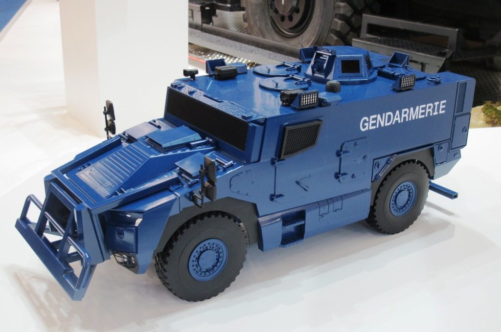 With its Titus RAID on exhibition in real Nexter exhibited at Milipol its capabilities in the paramilitary world, including ground robots of different kind. However the newest addition came in the form of a model, this being the Serval 4×4 proposed to the Gendarmerie, this police corps being in the need of updating part of its ageing vehicles park. Developed as part of the Scorpion programme launched by the French Army, and was initially known as the VBMR Léger, which stands for light Armoured Multi-Role Vehicle. The aim was to equip rapid deployment units, one A400M being able to carry two of those vehicles that has a combat weight of around 15 tonnes. The vehicle has just started its tests with the French DGA, the Armaments General Direction, and is produced by a team including Nexter and Texelis. Three versions are planned for the Army, armoured patrol vehicle, tactical communication node and ISTAR.