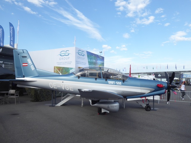 Also showcased at Le Bourget is an ISR variant of the smaller twin, the DA MPP Guardian equipped with a Thales reconnaissance pod. Diamond has delivered two DA42 MPP as well as two DA62 MPPs, each designed and modified to be capable of carrying three different sensor configurations including the Thales Avni Long Range Oblique Photography Sensor, the Thales I-Master SAR and EO/IR Gimballed Turret Sensor System and the Thales Avni WFOV and EO/IR Gimballed Turret Sensor System. Making its debut at Le Bourget is the Diamond Aircraft Reconnaissance Trainer (DART) 550. Powered by a 550 shp General Electric H75-A flat-rated, ECU controlled turboprop engine and equipped with Garmin G3000 glass cockpit with touch-controlled flight deck and fully integrated 3-axis autopilot, the tandem seat trainer is fitted with Martin-Baker MK16 ejection seats. The DART 550 on display was carrying an auxiliary fuel tank and, shown for the first time, a Leonardo Seaspray 5000E Active Electronically Scanned Array (AESA) multi-mode surveillance radar on the under wing hard points. Optional ISR equipment includes a belly-mounted FLIR turret.