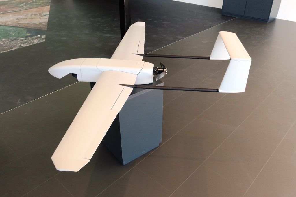 At Eurosatory Rheinmetall exhibited the Aladin 2.0, which is a wholly new product although it remains in the same category. The new UAV, which is of course proposed to the Bundeswehr for the replacement of the previous generation mini-UAV, has a MTOW lower than 5 kg and carries a 750 grams payload. It has a wholly new configuration, with a mid-wing, a pushing propeller, a twin boom tail with vertical rudders and high stabilizer. As the is now free from the propeller, the Aladin 2.0 is fitted with a front modular cone that integrates the payload and is easily interchangeable on the field thanks to a quick connection system both mechanical and electrical.