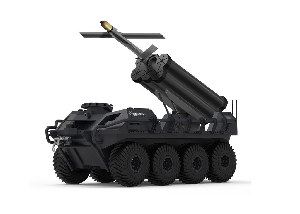As with other versions of Rheinmetall’s flagship autonomous vehicle, this new Mission Master – Protection is based on an 8×8 all-terrain platform capable of performing dangerous missions in hostile weather conditions, with the specific purpose of enhancing combat effectiveness. The integrated WARMATE micro combat unmanned air vehicle (UAV) opens up a range of new offensive and observation capabilities. It is capable of scanning the battlefield, detecting and determining exact enemy positions and, when the decision is made, engaging them. When an attack is aborted, the WARMATE can be recalled, can continue loitering, or be directed at another target.
