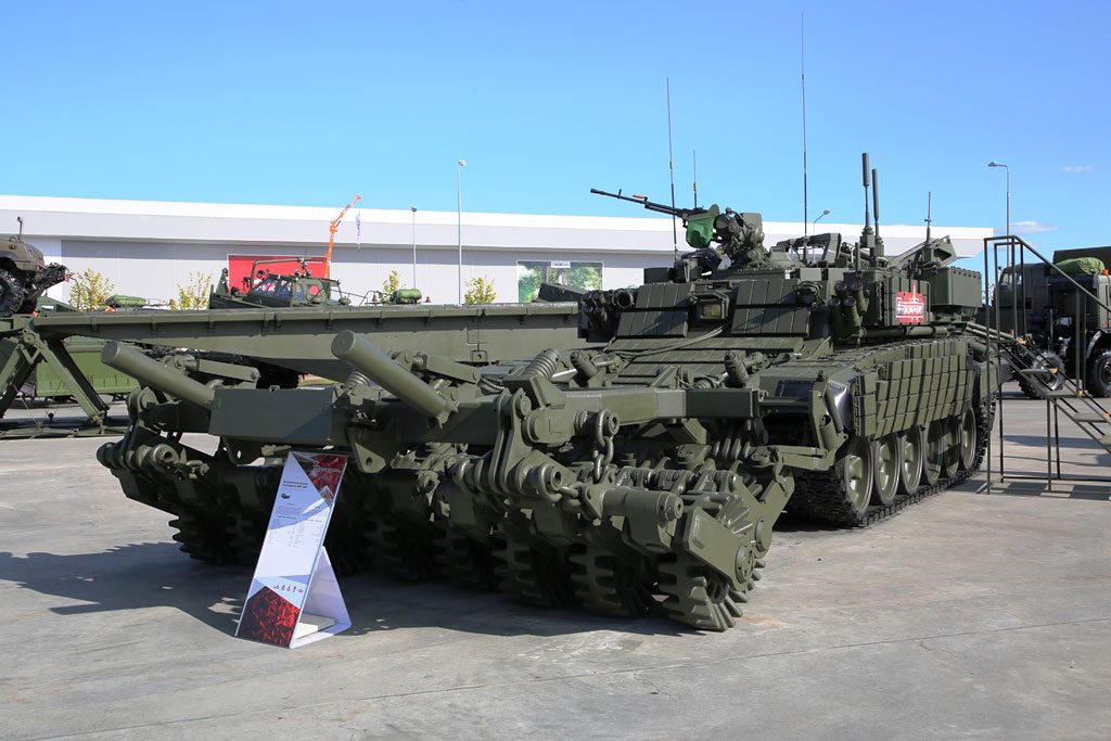 The second vehicle seen at Army 2018 was the UBIM, a multirole engineering vehicle. The base chassis can be either a T-72B3 or a T-90M, which is fitted with a dozer blade at the front and a crane boom on the right side of the vehicle. The latter can be fitted with different tools at its extremity. According to data provided at Army 2018, the UBIM is capable to advance under fire and in NBC contaminated areas clearing tree entanglements at 400-450 m/h or stone roadblocks at 350-400 m/h.