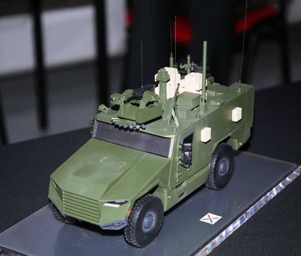 Three main versions will be provided to the Armée de Terre, VPB (Véhicule de Patrouille Blindé – armoured patrol vehicle), SA2R (Surveillance, Acquisition, Reconnaissance et Renseignement – surveillance, acquisition, reconnaissance and intelligence), and NCT (Nœud de Communication Tactique – tactical signal node). In its basic sub-version, the Infantry one, the VPB will be able to carry 10 soldiers, driver, gunner, commander and seven infantrymen. It will be fitted with an RCWS, either the T1 or T2 developed by Renault Trucks Defense within the Scorpion programme; they may be armed with 7.62 and 12.7 mm machine guns and 40 mm AGLs. One pintle-mounted Minimi machine gun is fitted at the rear, the machine gunner being protected by side armour plates. Beside the Infantry one, nine other sub-versions are planned, Command Post, Medevac, Engineer, MMP missile carrier, 81 mm mortar carrier, Artillery Observer, 120 mm mortar towing vehicle, SATCP GBAD carrier, and Resupply. The Nexter-Texelis team will deliver one version, the DGA then acquiring the specialised kits according to the Army needs. The VPB will the first version to be developed, the prototype being expected in 2020 while qualification is planned for late 2021. The SA2R will follow one year later and will be available in ot sub-versions, fitted with a surveillance radar or an optronic package, these vehicles providing surveillance and reconnaissance for the regimental Task Force; to ensure long time of operation when static, it will be fitted with an APU (Auxiliary Power Unit). The NCT qualification is scheduled for 2023, this having four sub-versions, dedicated to widen the radio coverage of the Task Force providing radio relay among units.