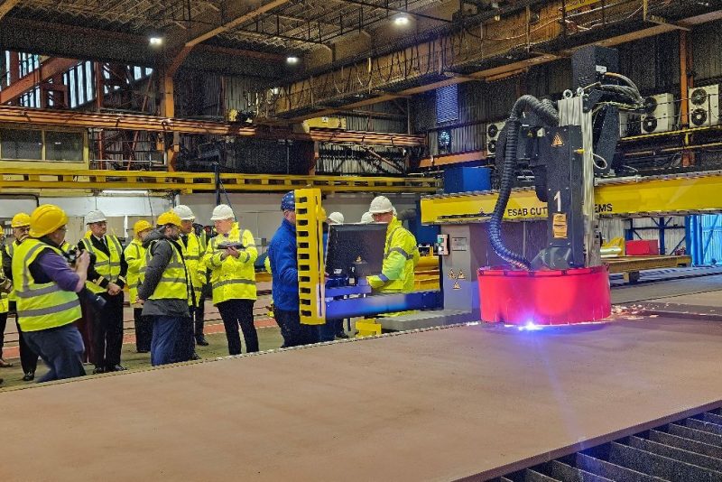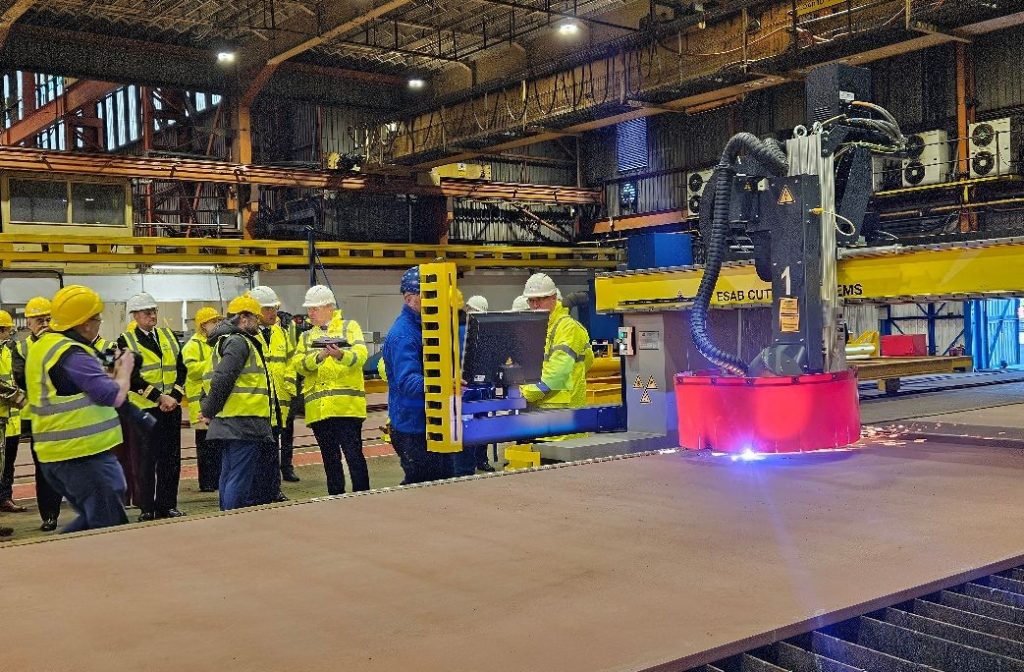 The revitalisation work across Harland & Wolff includes installation of cutting-edge equipment such as robotic plasma cutters, a fully mechanised flat panel line, and automated quality control systems. Upgrades to delivery systems, stockyard management, and digital integration are also progressing, ensuring FSS vessels can be delivered with greater speed and precision. In Appledore, investment includes new roofing and a new plasma cutter, used to cut steel today.
