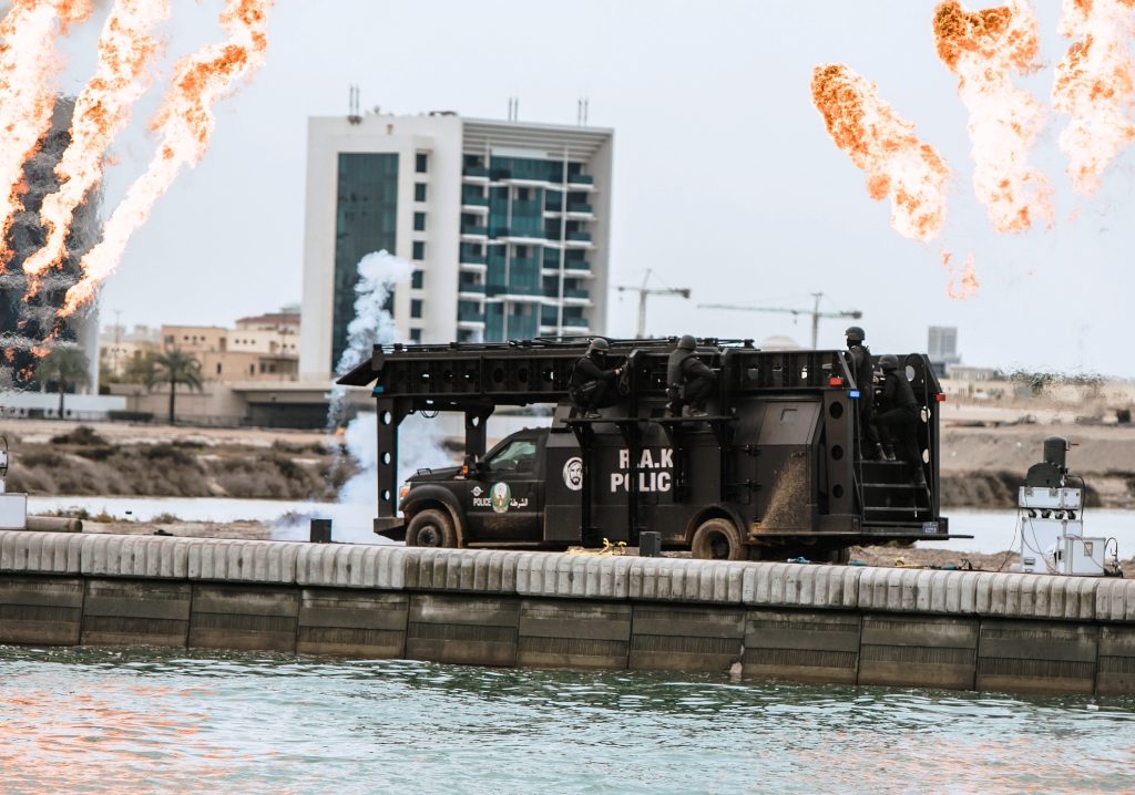 Guests and the media witnessed extraordinary simulated assault attack situations demonstrating the capabilities of the range of products on land and water. This was done in conjunction with RAK SWAT teams and guests were blown away by the performance of STREIT armored vehicles, namely the Scorpion, Typhoon, Gladiator, Cobra, Cougar, Python, Falcon, Riot Control vehicles, etc. as well as the armored boats.