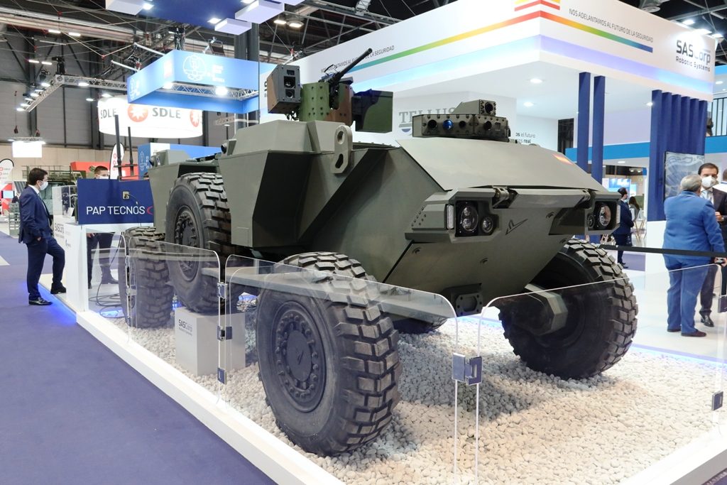 “Propulsion is based on a Jaguar turbodiesel engine providing 350 hp, which is used to charge the battery pack currently made of Lithium-Io batteries, although we are looking to new solutions in order to have lighter batteries that would allow us increasing the payload,” Noemi Fernández Gil, the company Chief Operating Officer tells EDR On-Line in the company booth at FEINDEF. Batteries then power the six motors that ensure the movement of the 13R20 wheels, allowing the Valkyrie to reach a maximum speed of 40 km/h. No further details were provided about electric motors.