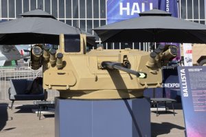On the right of the BTR-22 a new turret was exhibited; known as Ballista, this remotely operated turret is armed with the 2A42 30 mm automatic cannon with 300 rounds, a PKT-M 7.62 mm coaxial machine gun with 2,000 ammunition, two 9M113M Konkurs-M SACLOS anti-tank guided missiles, and six Tucha smoke grenade launchers. The sighting system includes a daylight TV camera, the PNK thermal imager, and a laser rangefinder. Elevation angle is -5°/+70°, the latter a key factor when operating in urban scenarios. The Ballista is offered as an option to the older BTR-82A turret, the new unmanned turret having a mass of 1,650 kg without ammunition.