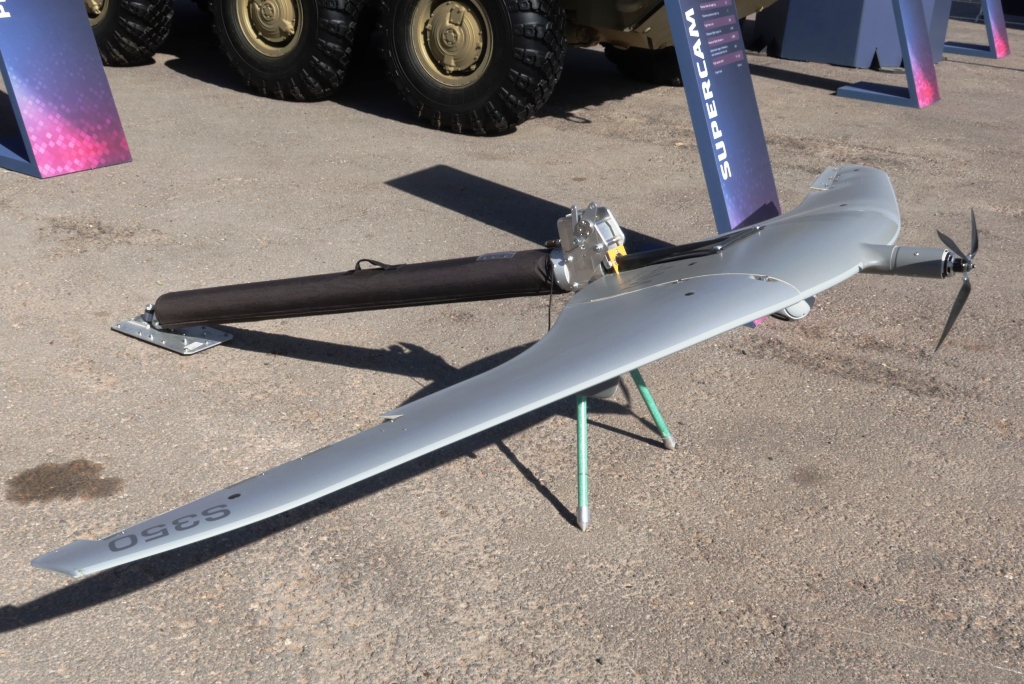 One of the assets used for target acquisition was also exhibited at WDS: the Supercam 350 UAV is a swept wing airframe powered by an electric motor located at the front oof the fuselage, activating a three-blade pulling propeller. The optronic gimbal is located under the fuselage, around the centre of gravity, payload being 2 kg over the 15 kg of the take-off mass; EDR On-Line understood that the sensor installed is either day or night, soldiers switching it depending on the mission. The Supercam 350 in the current version has an endurance of 5.5 hours at cruise speed, 75-120 km/h, operational range of the data link being 100 km while maximum flight altitude is 5,000 metres. Take-off is done by catapult, pneumatic or elastic, and lands using a parachute.