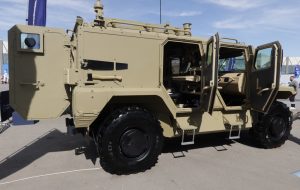 At the Rosoboronexport outdoor static exhibition at WDS the Sarma was shown alongside the ABSh-2 Atlet command and control vehicle, which is fitted with the Planshet-A artillery and mortar C2 system. This is the standard indirect fire C2 system adopted by the Russian Army that allows an artillery battery or battalion to deploy in only six minutes, while a battery can be ready to fire when deploying on unprepared terrain in only 9 minutes. Two minutes are used for geospatial survey. Once ready, it takes less than 50 seconds at battalion level and 30 seconds at battery level for generating firing data against unprepared targets. The radio net that supports the artillery C2 system is the R-187 Arzar, the vehicle version operating on HF, VHF and UHF bands.
